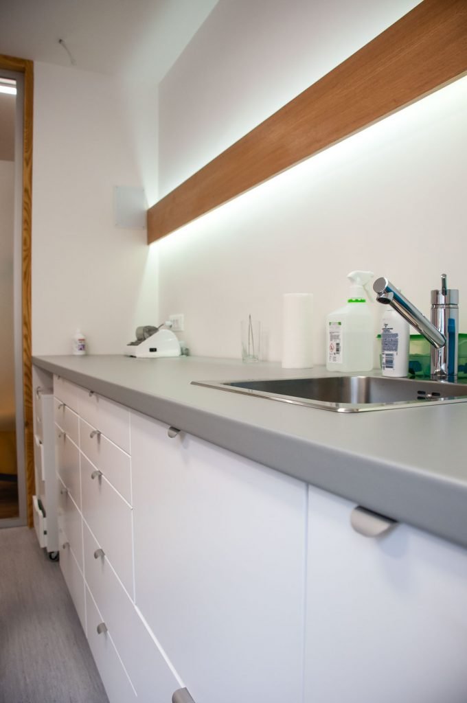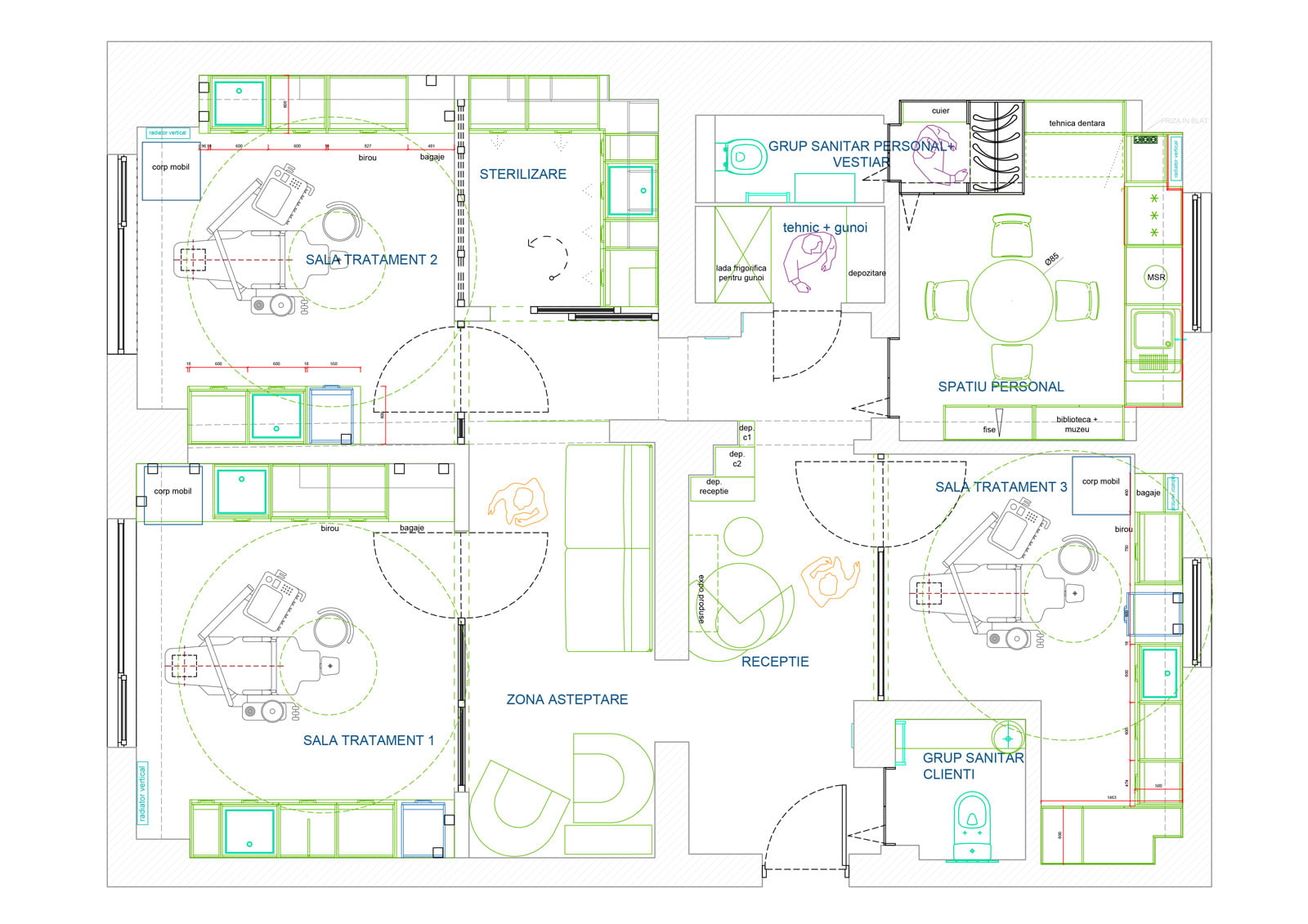 Cabinetele rezultate sunt gândite astfel încât să existe același volum de depozitare și aceeași organizare, pentru a fi mai ușor de utilizat de catre personal indiferent de sala de tratament în care lucrează. În spațiul de oficiu angajați este prevăzut un loc de luat masa cu o mică bucătărie, unde angajații, în scurtele pauze se pot relaxa și socializa. Ne-am folosit de o compartimentare din mobilier pentru a crea vestiarul, care devine și spațiu de trecere către toaleta personalului. Astfel toata zona dedicata exclusiv personalului este separata de circulația din clinică și am evitat intruziunea paciențelor în acest spațiu.