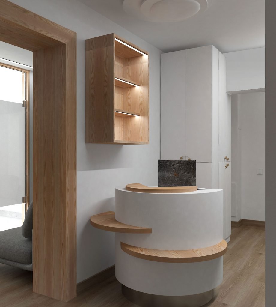 Ne-am folosit de o paleta de culori naturale, cu multe accente de lemn pentru a oferi senzația un spațiu primitor, calm. În momentul în care intri în acest spațiu dorim să ai un sentiment de „acasă”, fără să lipsească nota de profesionalism tipică unui cabinet stomatologic.