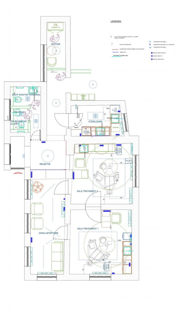 Spațiul sălilor de tratament a fost bine organizat, printr-un mobilier cu design modern bazat pe linii drepte, ce devin si accentul de culoare în aceste spații.